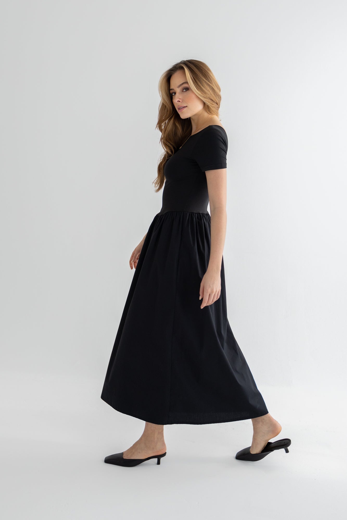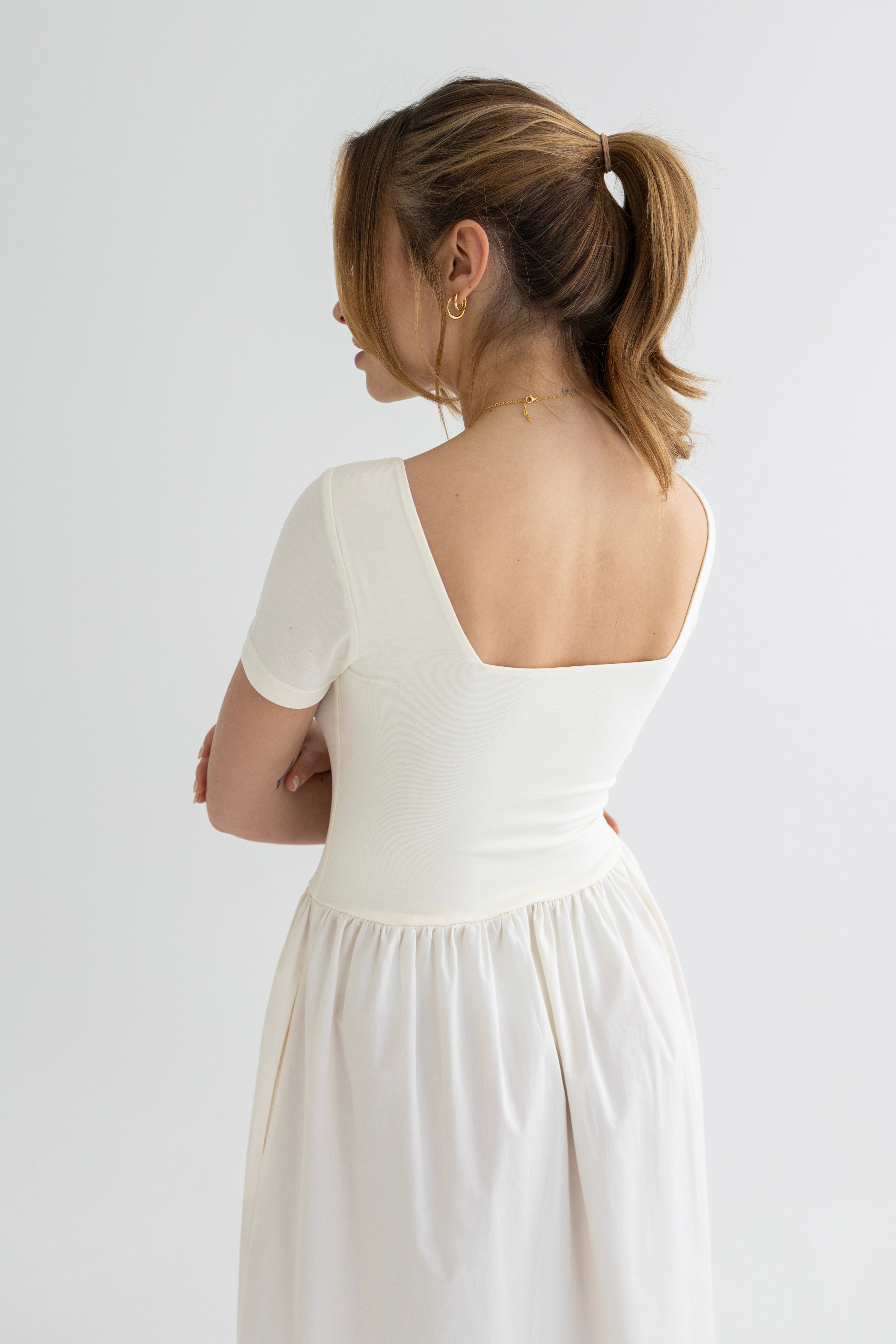 An iconic new piece for your capsule wardrobe. The timeless Naomi dress combines a tencel top with a lightweight poplin skirt. Clean lines, precise cut, the perfect balance of minimalism and elegance.