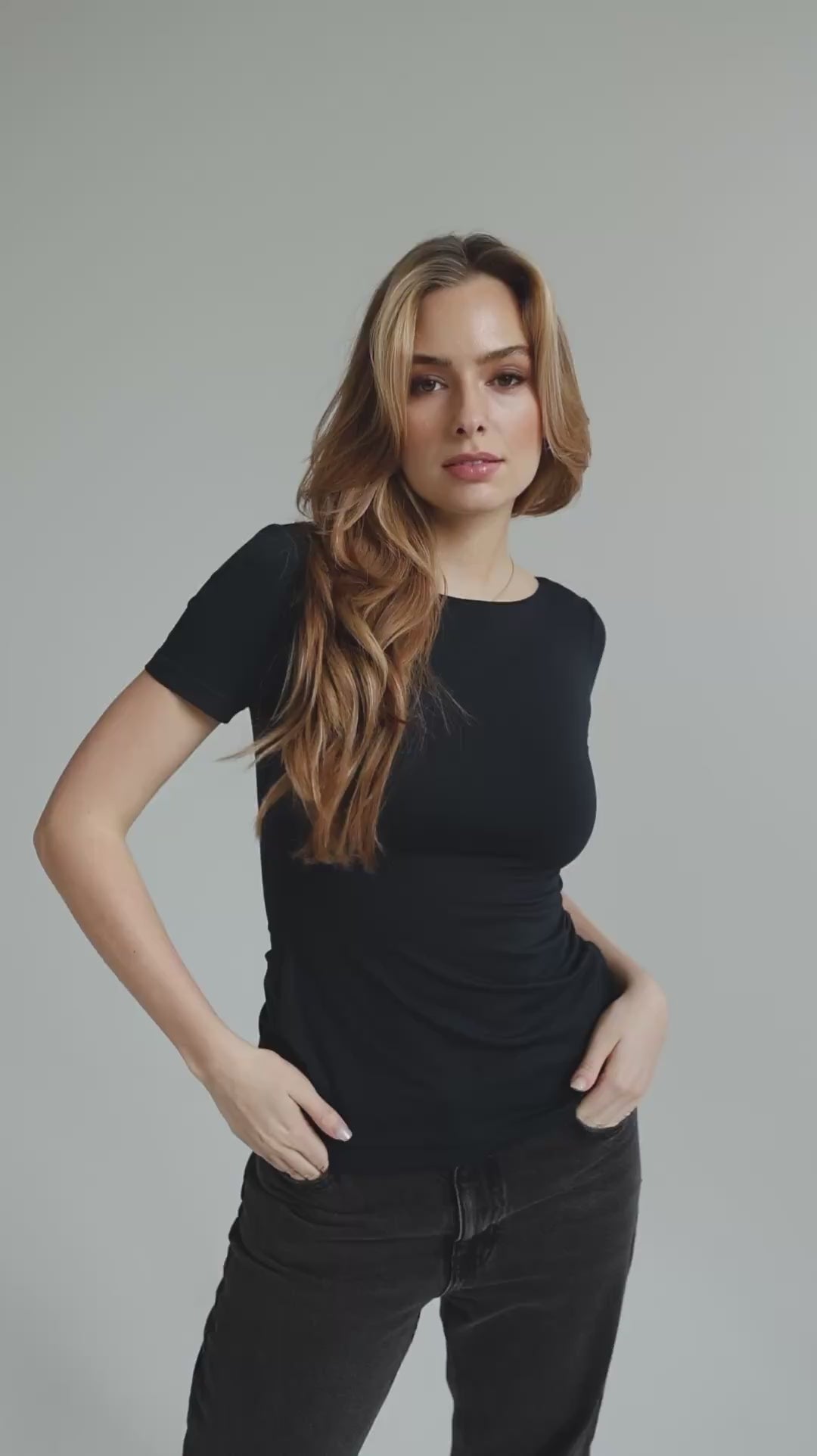Přiléhavý top s bateau výstřihem vpředu a odhaleným hranatým výstřihem na zádech. Dvojitě šitý přední a zadní díl vytváří hladkou, čistou siluetu. Možnost oboustranného nošení pro více variant stylingu.