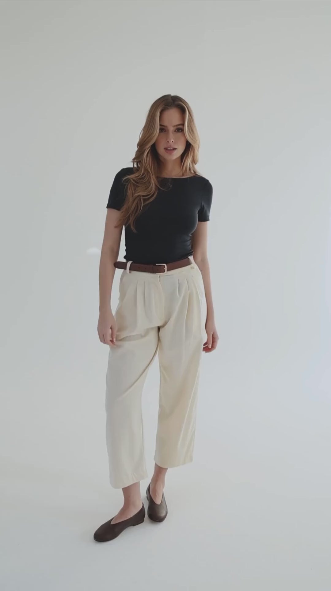 Splývavé kalhoty s uvolněnou barrel-leg siluetou a elegantními sklady. Ušité z lehkého a vzdušného TENCEL™ twillu s jemným washed look efektem. Lze nosit ve standardní velikosti jako high-waist nebo zvolit větší velikost pro mid-waist střih.