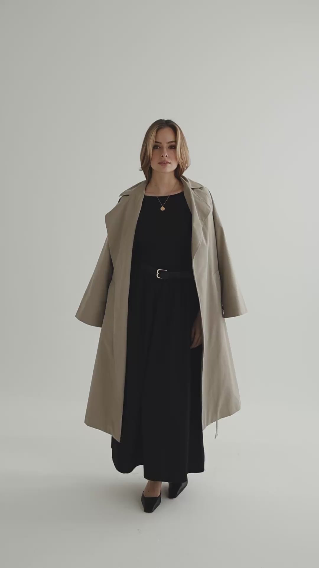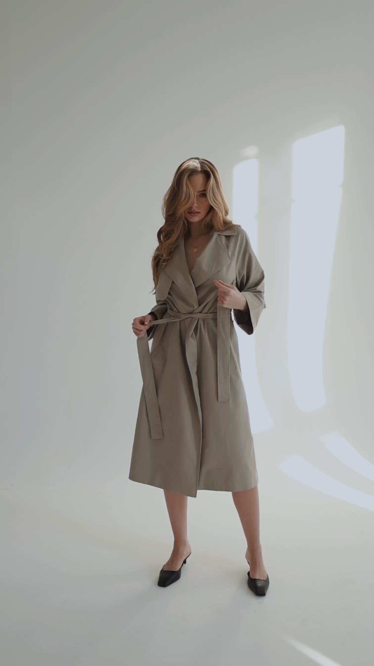 Moderní pojetí klasiky v minimalistickém designu. Lehký trenčkot ve studeném béžovém odstínu z kvalitního gabardénu s voděodolnou úpravou a peach finishem pro sametový dotek. Čistý zavinovací střih s raglánovým rukávem a páskem se snadno přizpůsobí postavě.