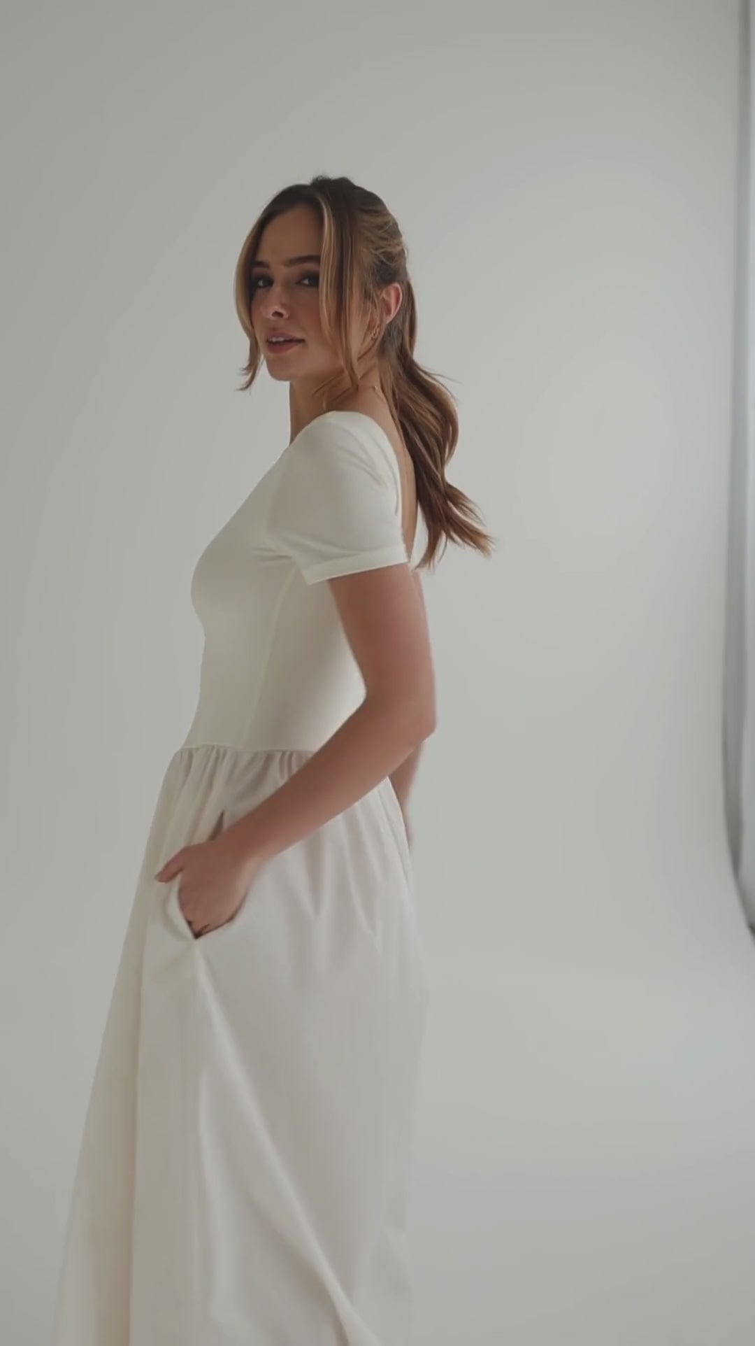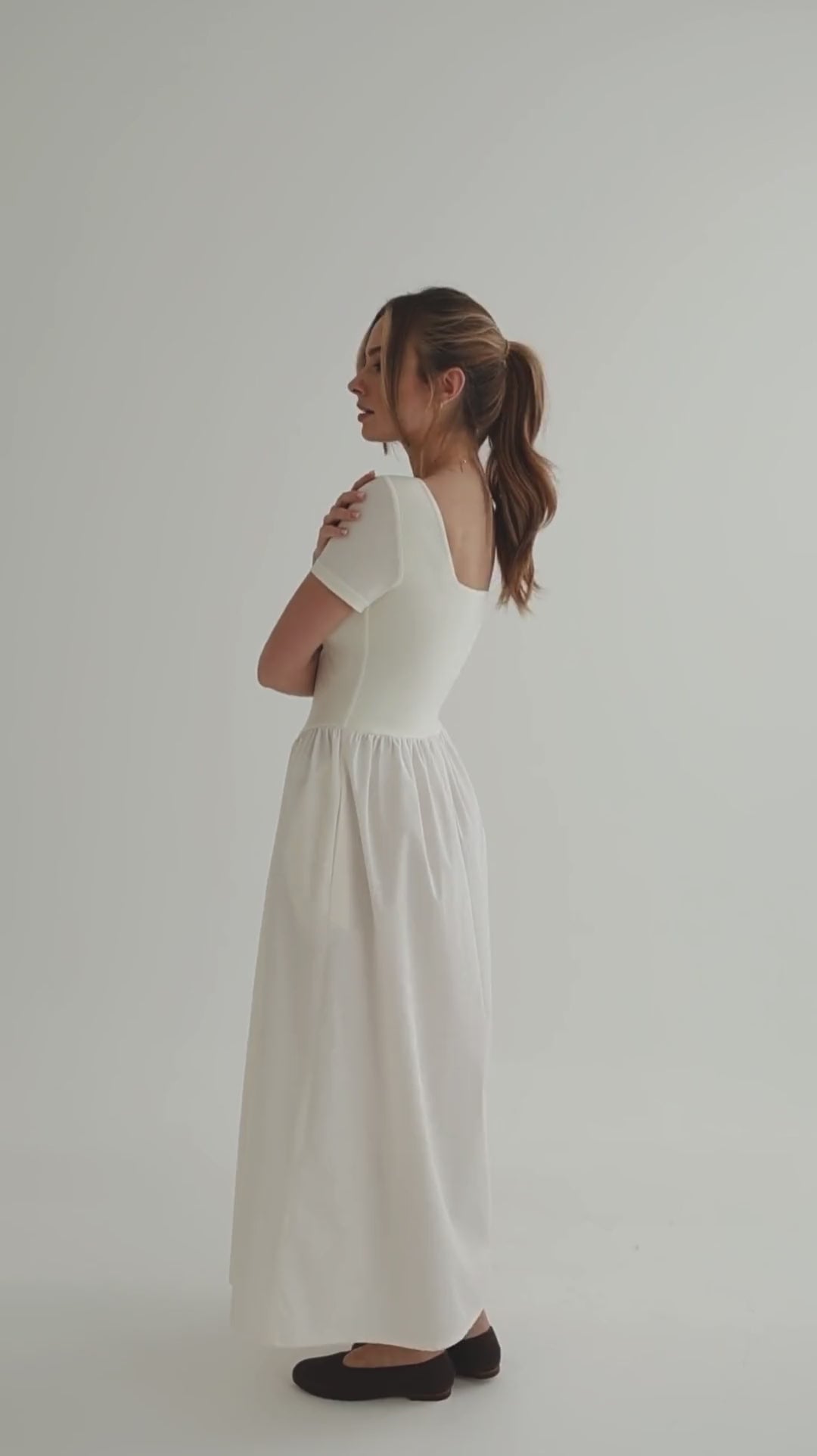Top z hladkého mercerovaného úpletu s jemným leskem kopíruje siluetu. Dvojité šití výstřihu zajišťuje čisté zakončení bez viditelných švů. Lehká, vzdušná sukně z organické bavlny přidává strukturu a nadýchaný vzhled. Skryté kapsy nenarušují linii šatů, ale přidávají na praktičnosti.